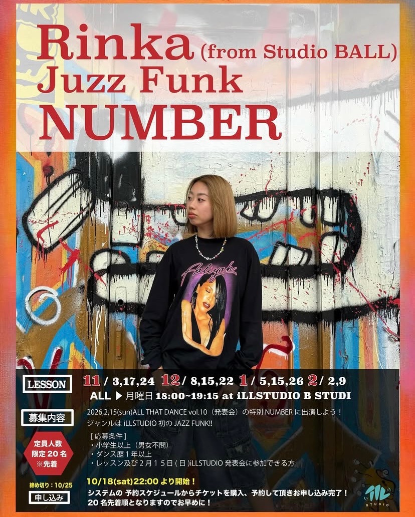 システムの『チケット購入』より「Rinka JAZZ FUNK NUMBER ○月 回数チケット」または1回チケットご購入ください。